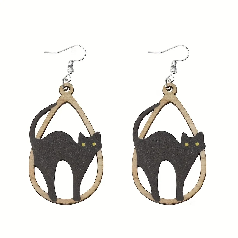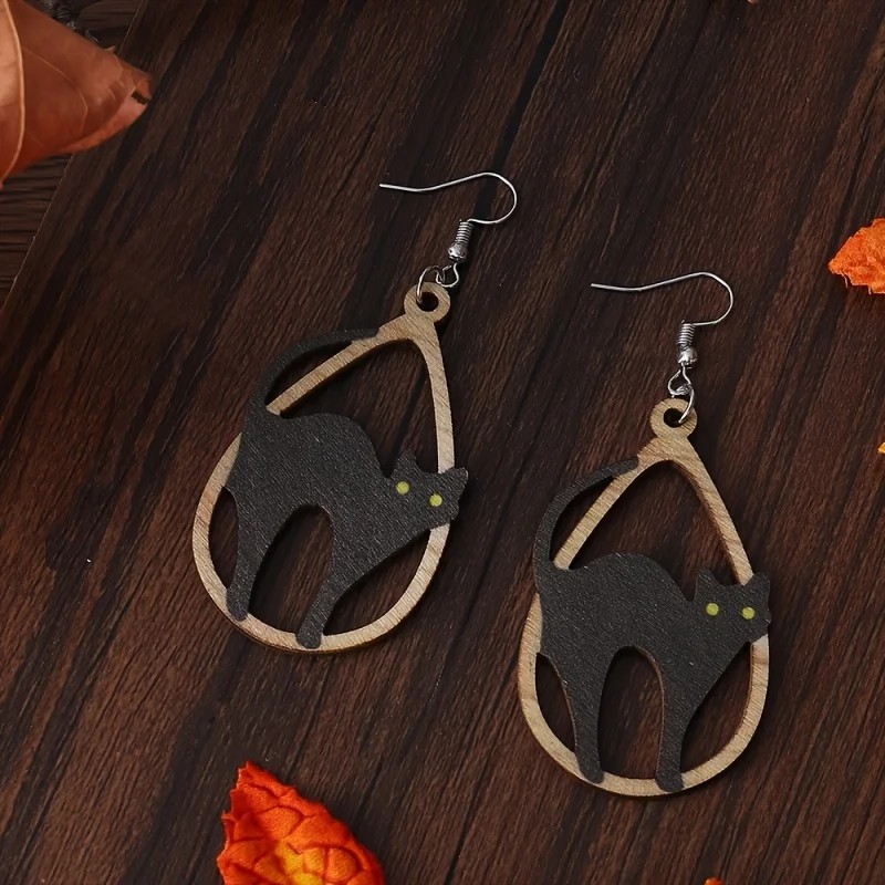 1 pair of new wooden Halloween black cat hollow drop pendant earrings Gothic style ladies earrings holiday gift