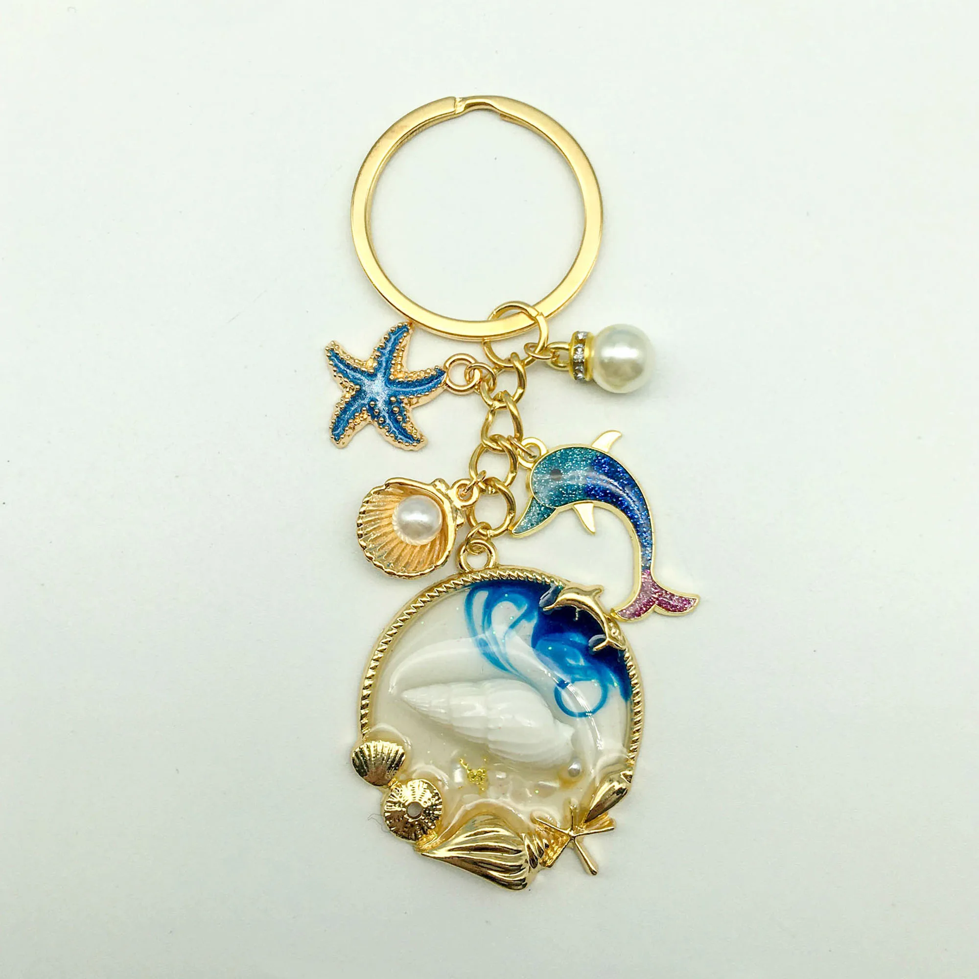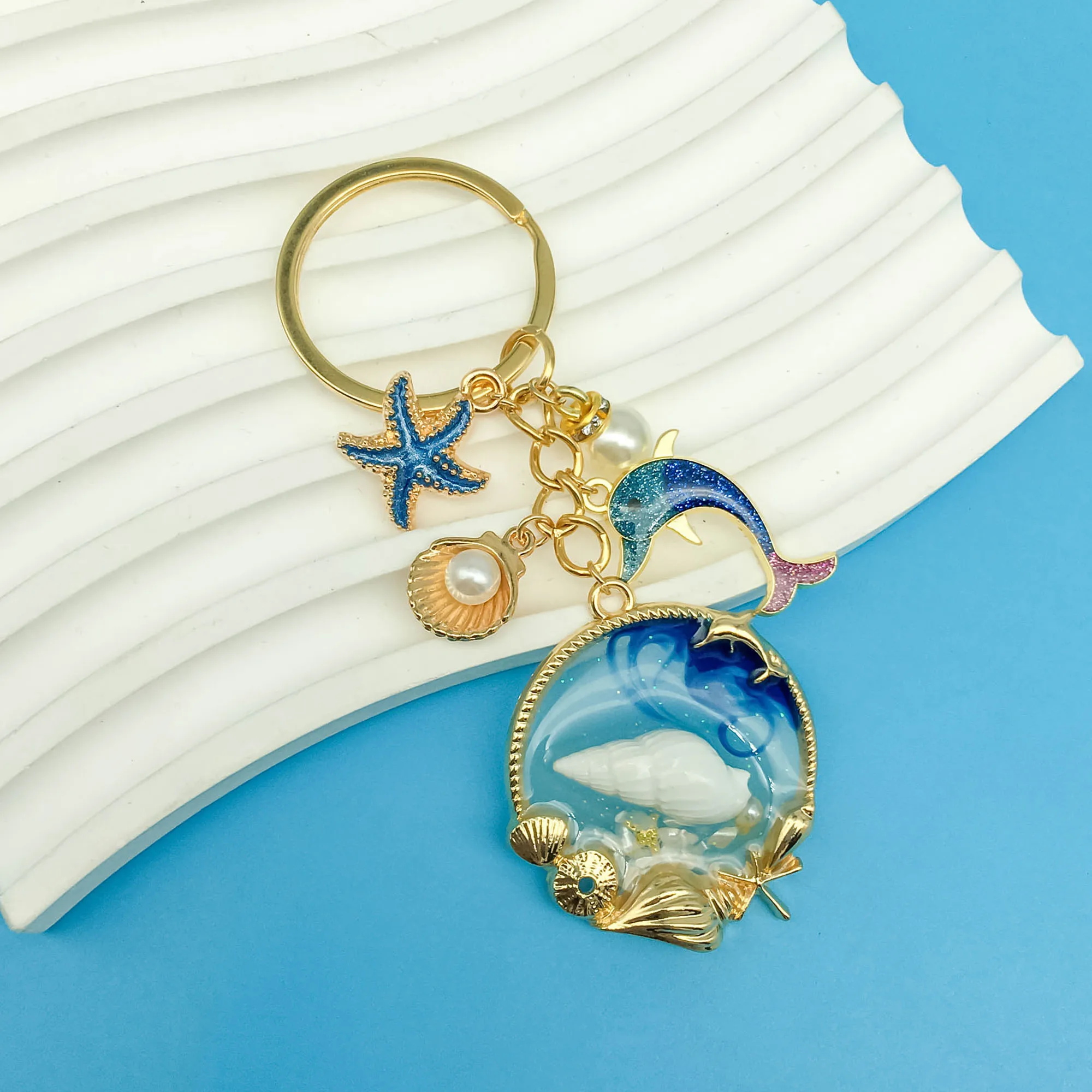 1PC Blue Dolphin Shell Starfish Alloy Enamel Inlaid Faux Pearl Charms Keychain For Women Key Ring Ornament