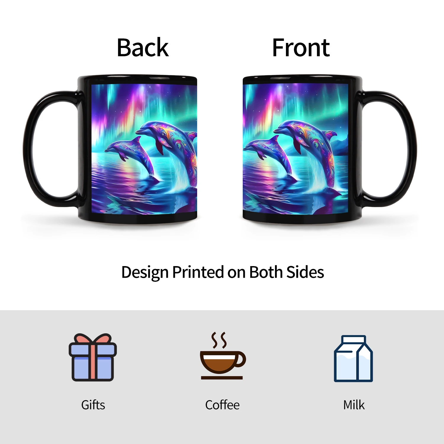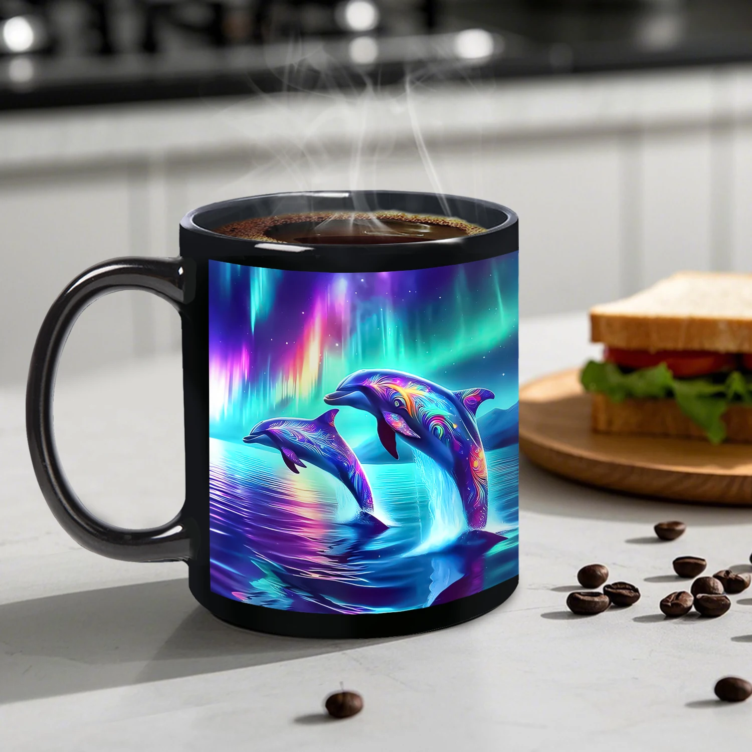1PC,Ceramic Mug with Stunning Dolphin & Northern Lights Design. Durable Black Ceramic Tea Cup for Pet Owners,11OZ