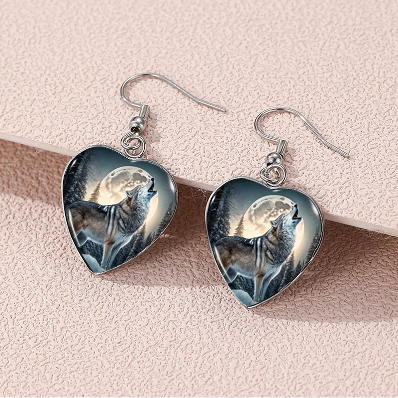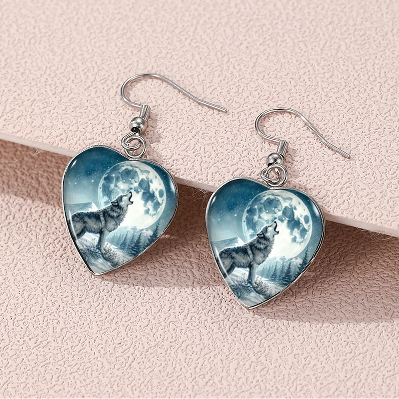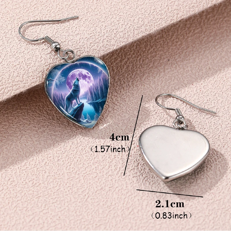 2024 New Howling Wolf and Moonlight Dangle Earring Heart Shaped Earrings Handmade Glass Dome Jewelry