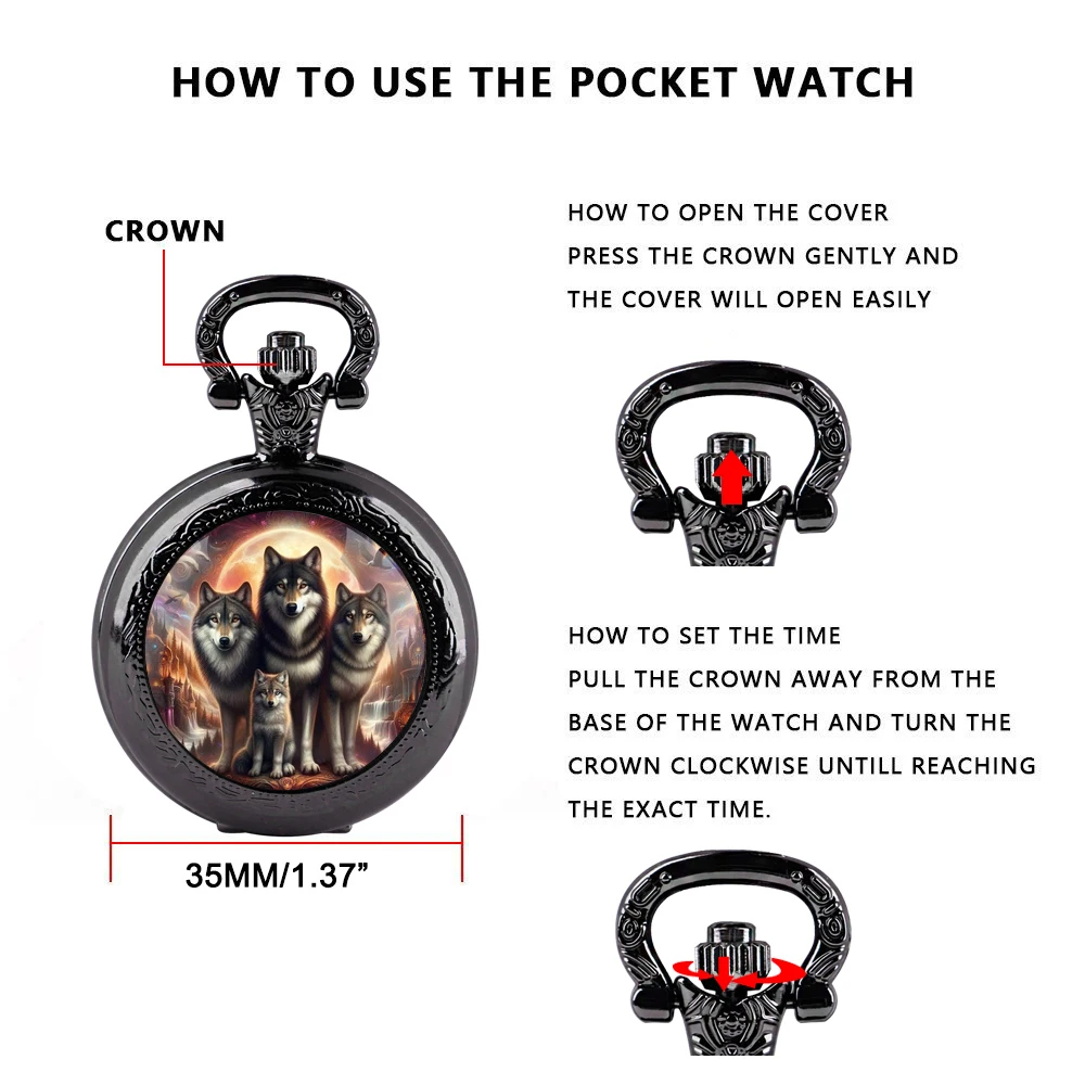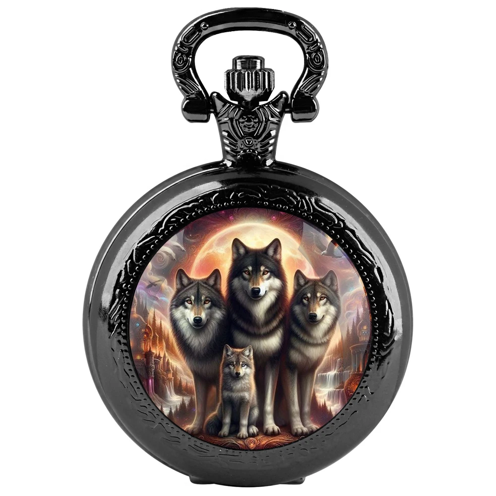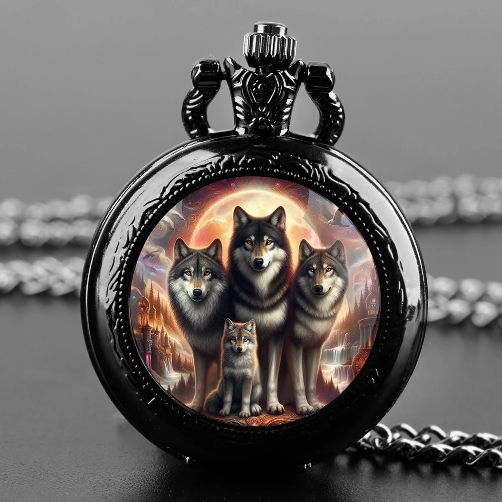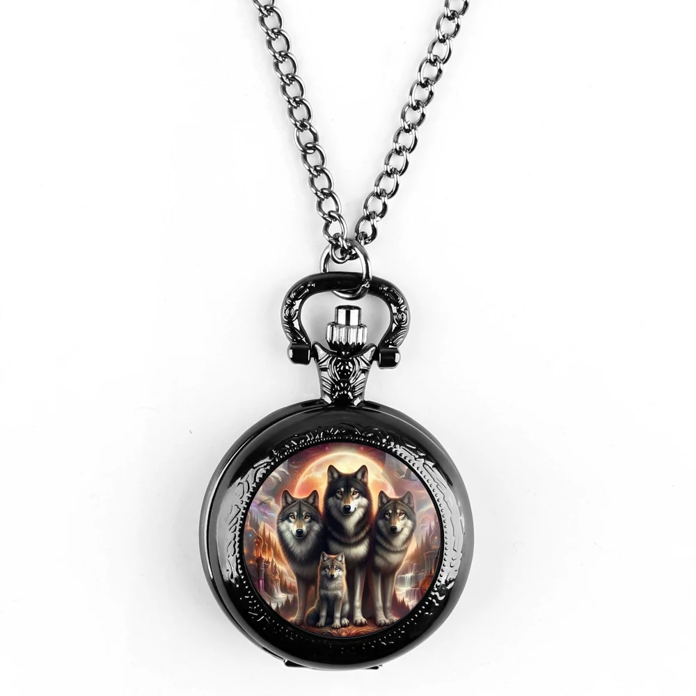 Classic Wolf Family Glass Dome Black Quartz Pocket Watch with Arabic Numerals Dial and Durable Chain Retro Gift for Men Women
