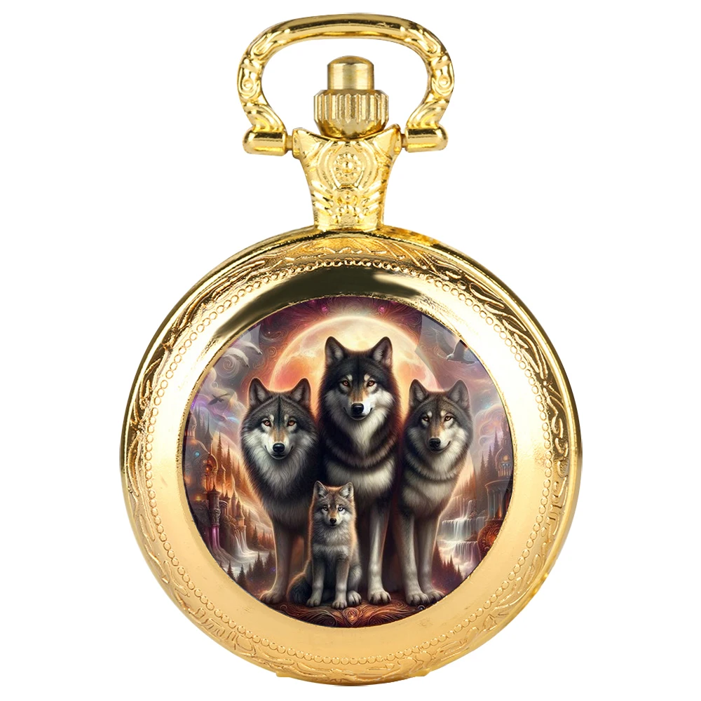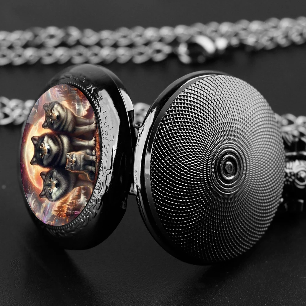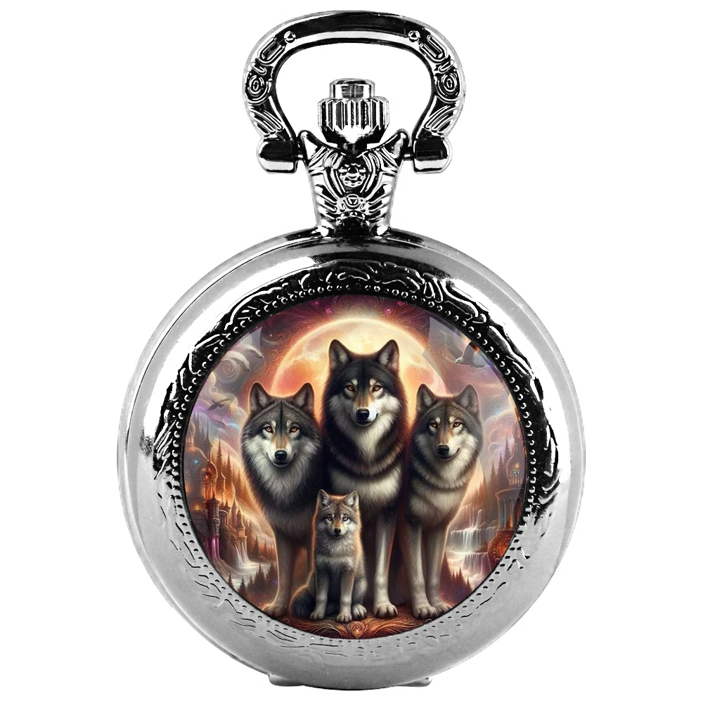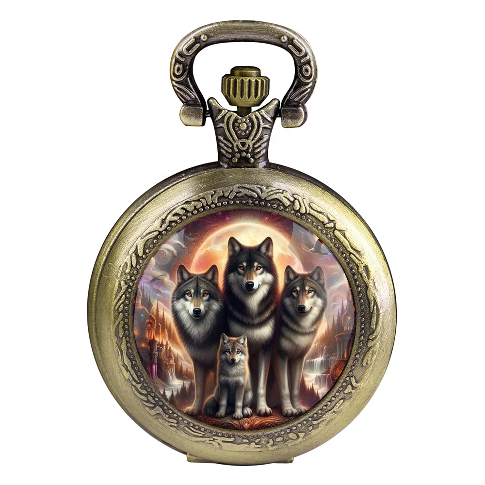 Classic Wolf Family Glass Dome Black Quartz Pocket Watch with Arabic Numerals Dial and Durable Chain Retro Gift for Men Women