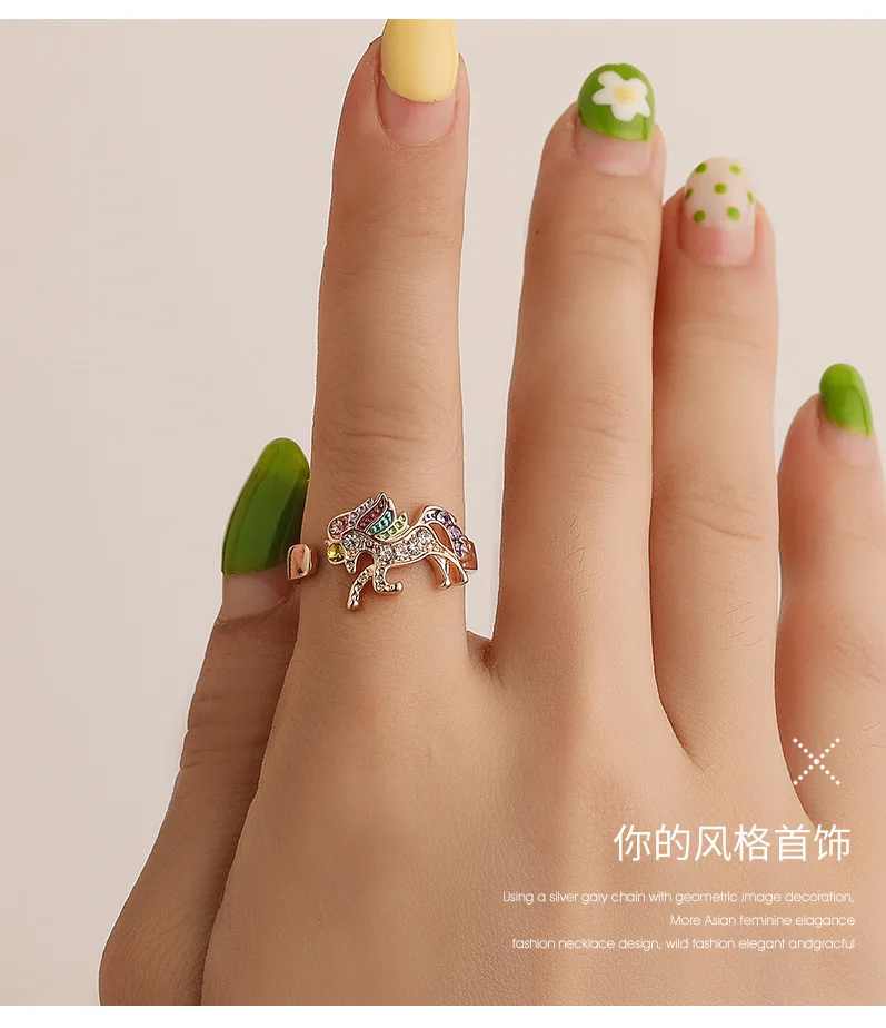 Cute Multicolor Zircon Unicorn Ring Fashion Cartoon Horse Jewelry Accessories For Girls Children Kids Women Party Animal Jewelry