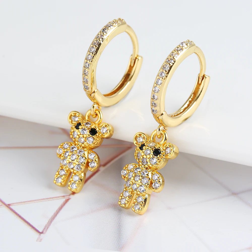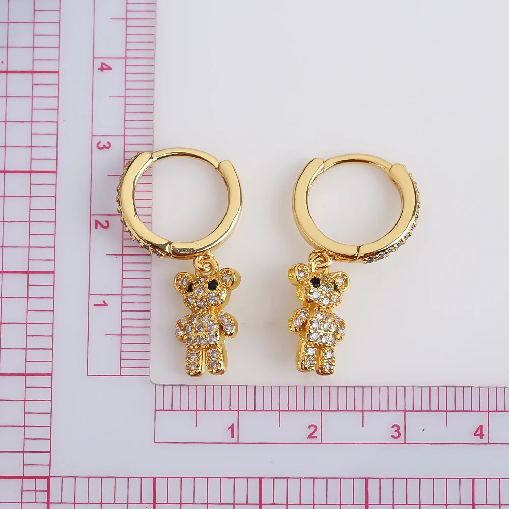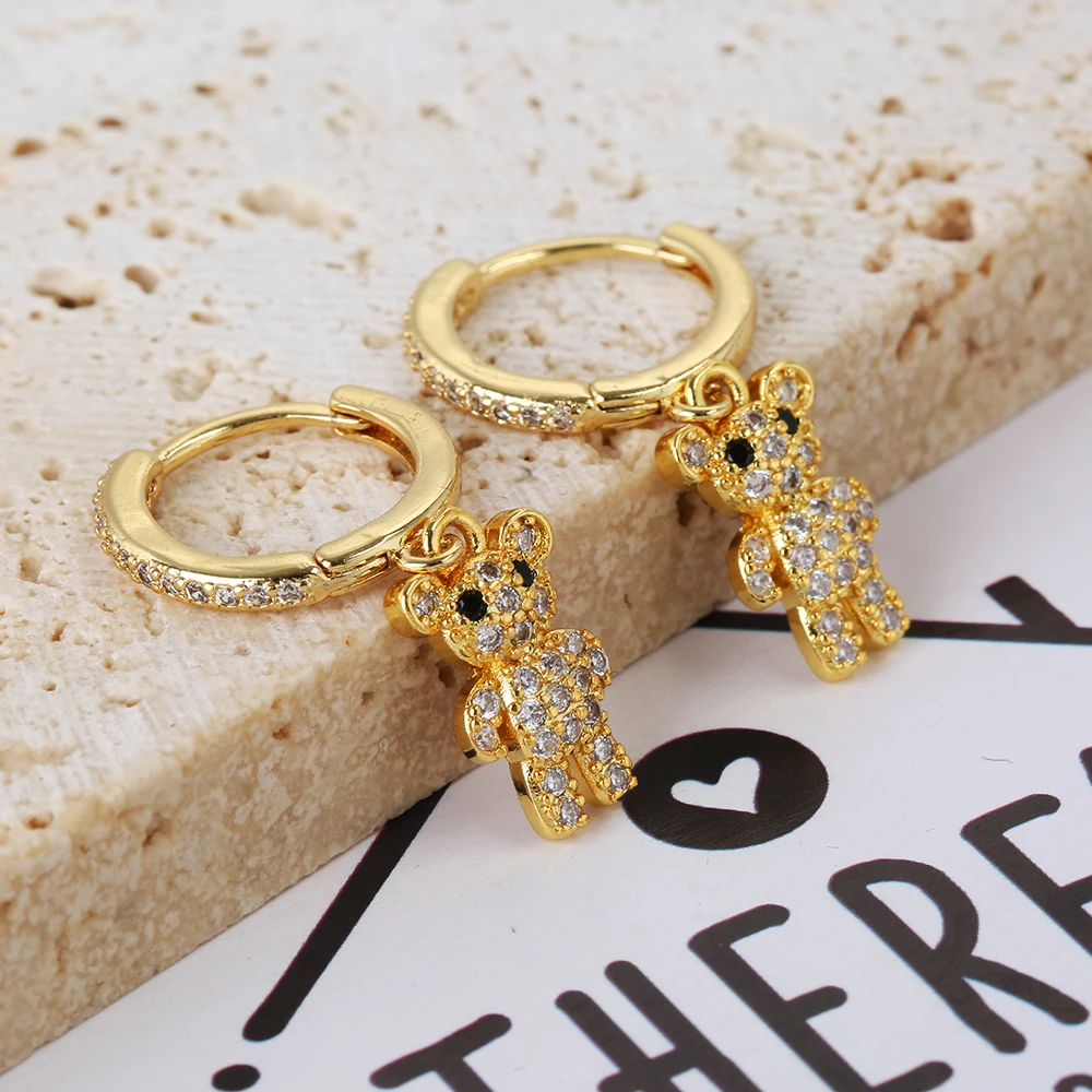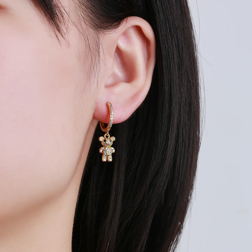 Dancing Cute Teddy Bear Diamond Inlaid 18K Gold-Plated Luxury Lady Ear Clasp Bride's Creative Gift Earrings Simple