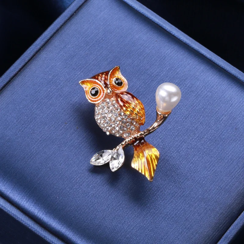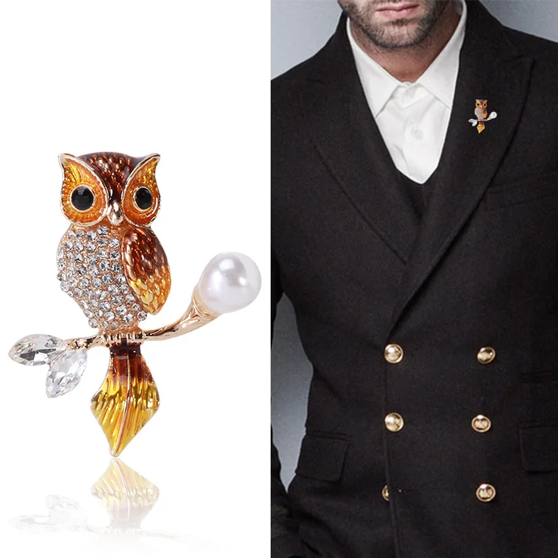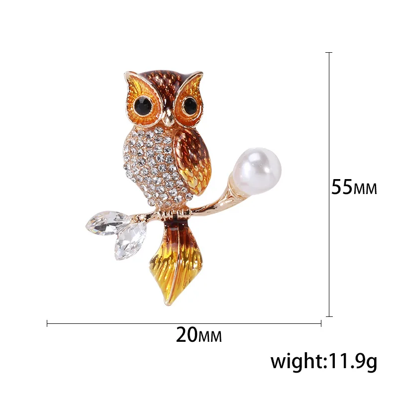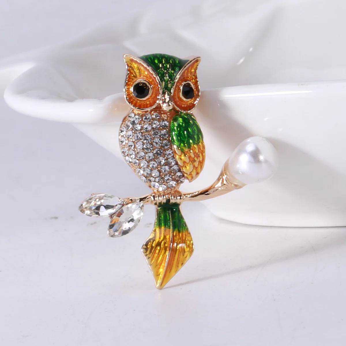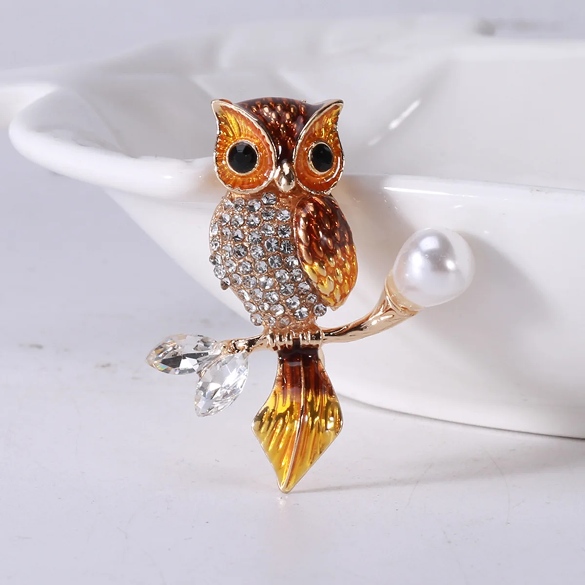 Exquisite Rhinestone Pearl Owl Brooch For Women Man Suit Sweater Enamel Bird Animal Brooches Office Party Accessories Jeweley