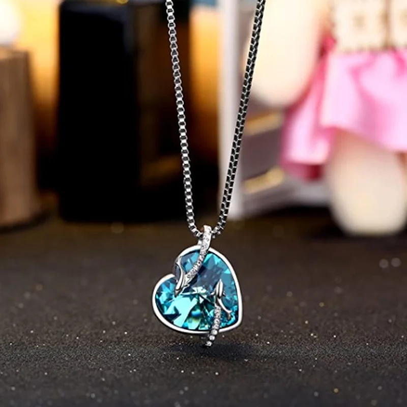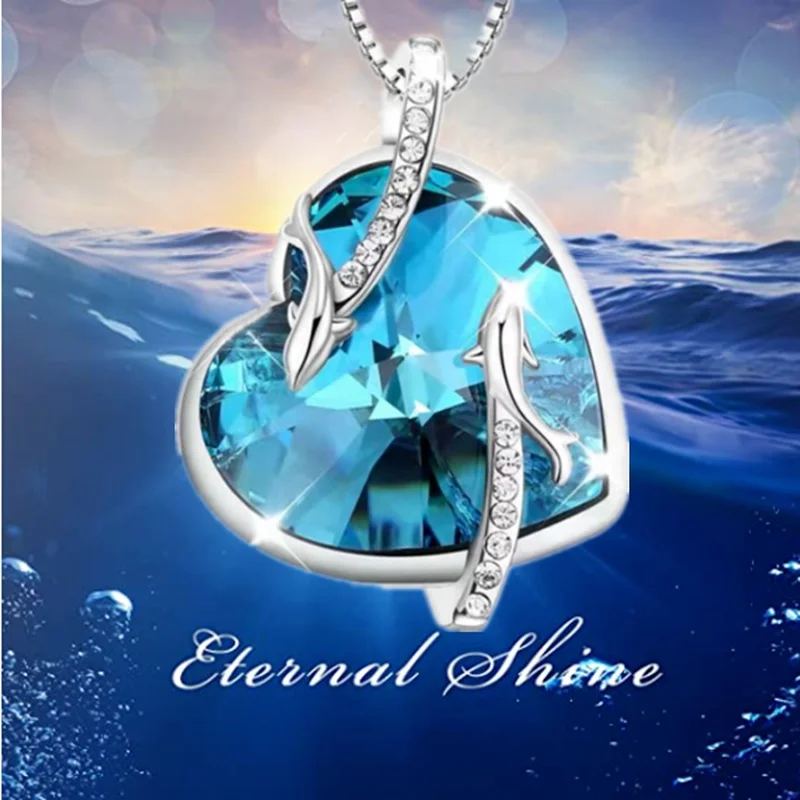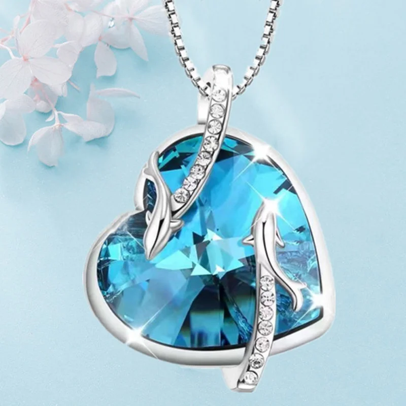 Fashion Dolphin Necklace Heart Sapphire Zircon Crystal Pendant Engagement Necklaces for Women Animal Jewelry Anniversary Gift