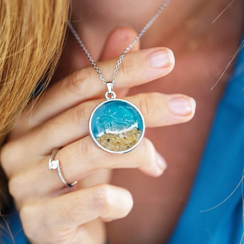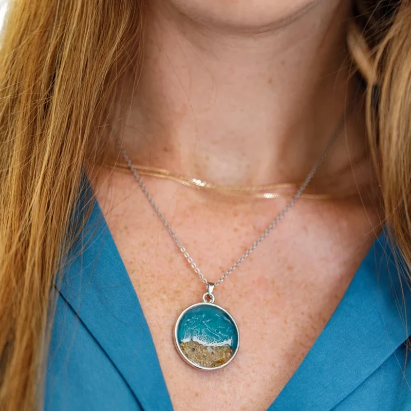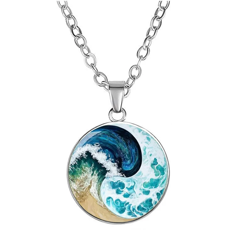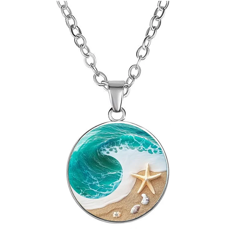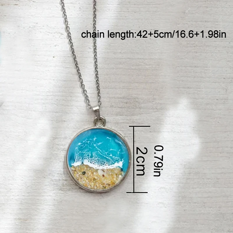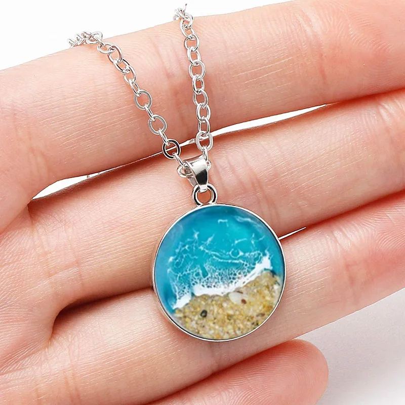 Fashion Round Blue Sea Wave Beach Glass Dome Pendant Necklace For Women Summer Ocean Jewelry