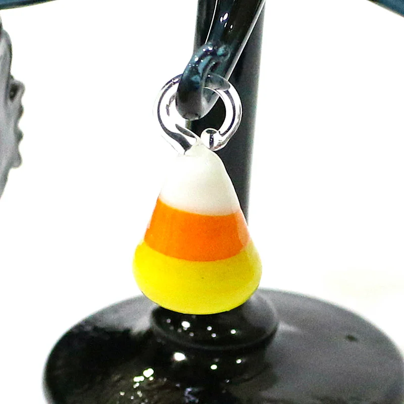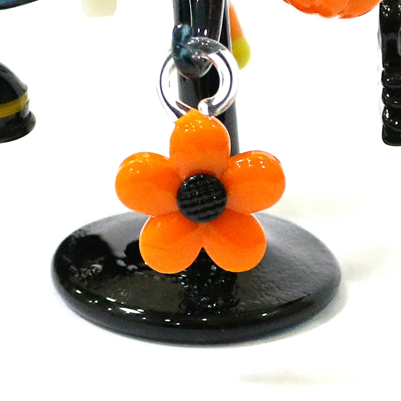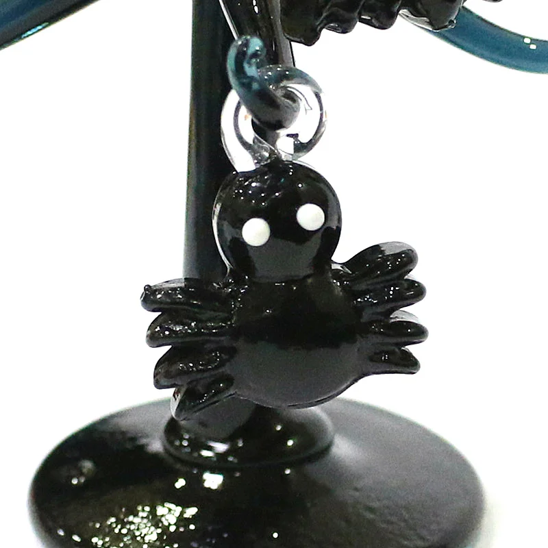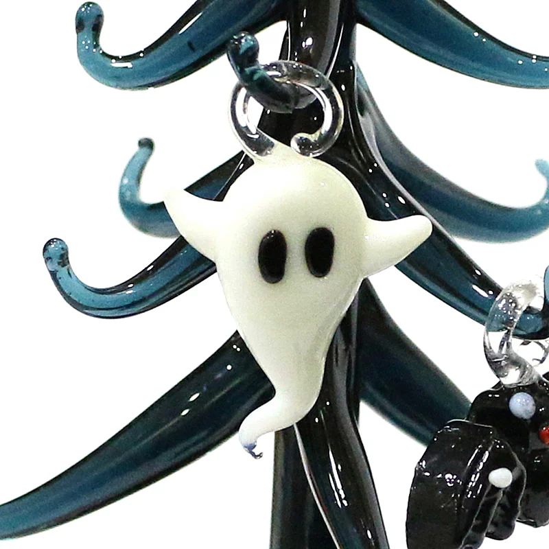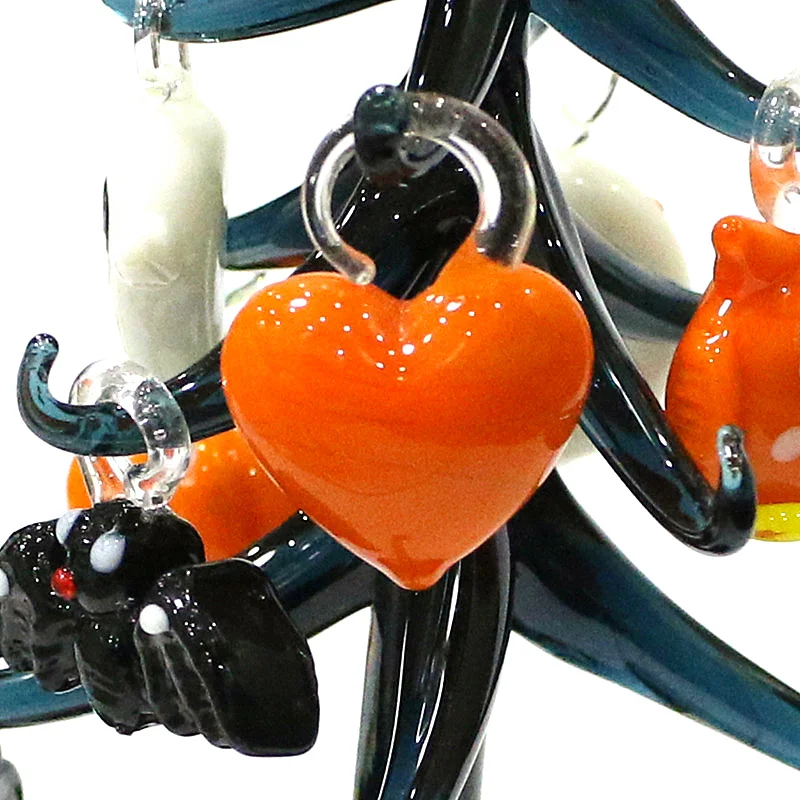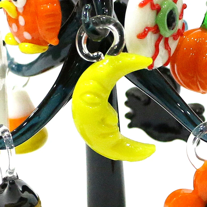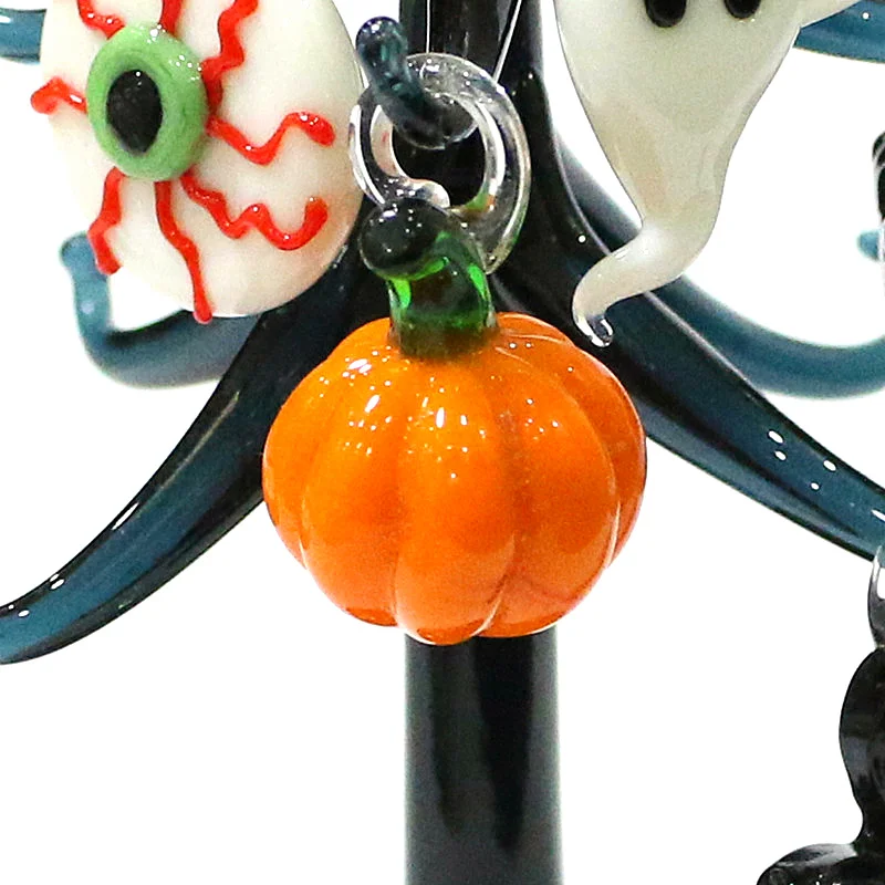 This Halloween decor features a cute glass tree figurine with mini owl, spider, bat, pumpkin, cross, ghost, evil eye, heart, moon, and hat pendant, offering a unique and spooky aesthetic.