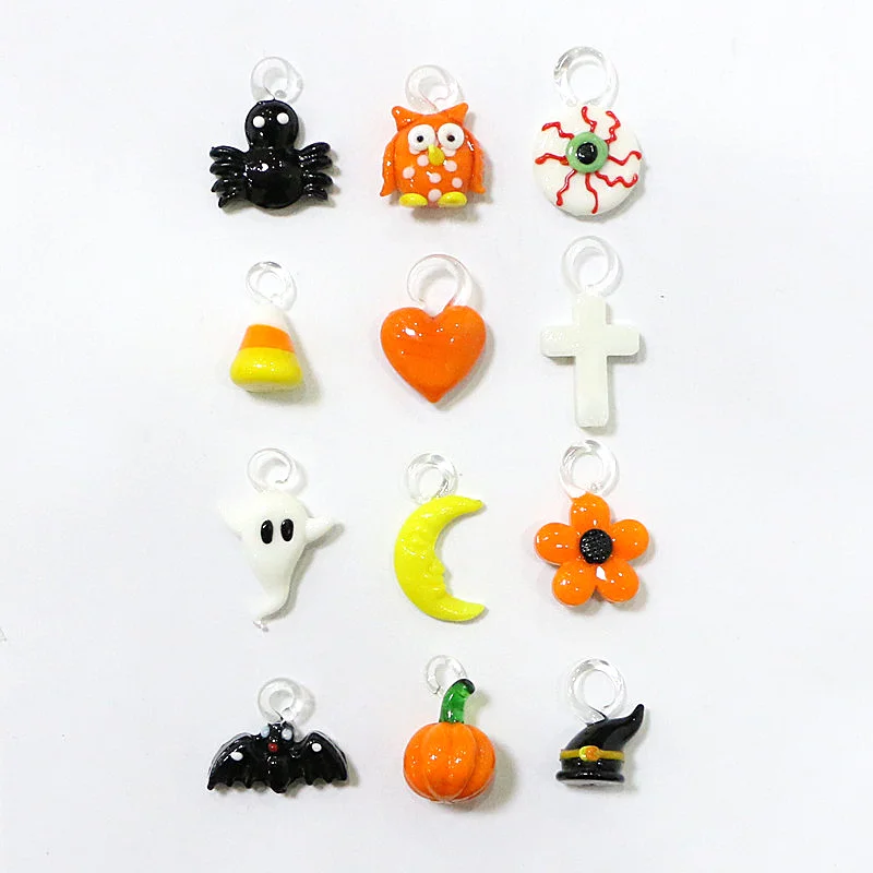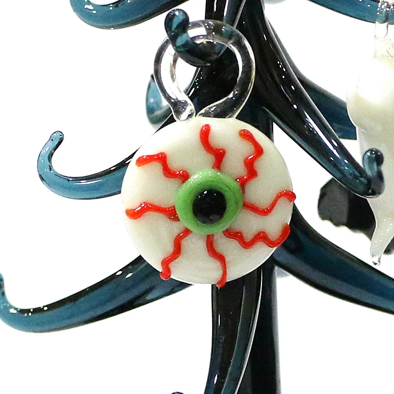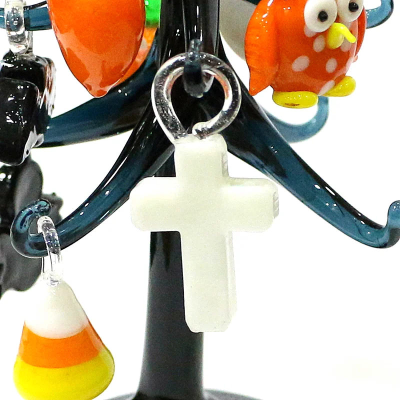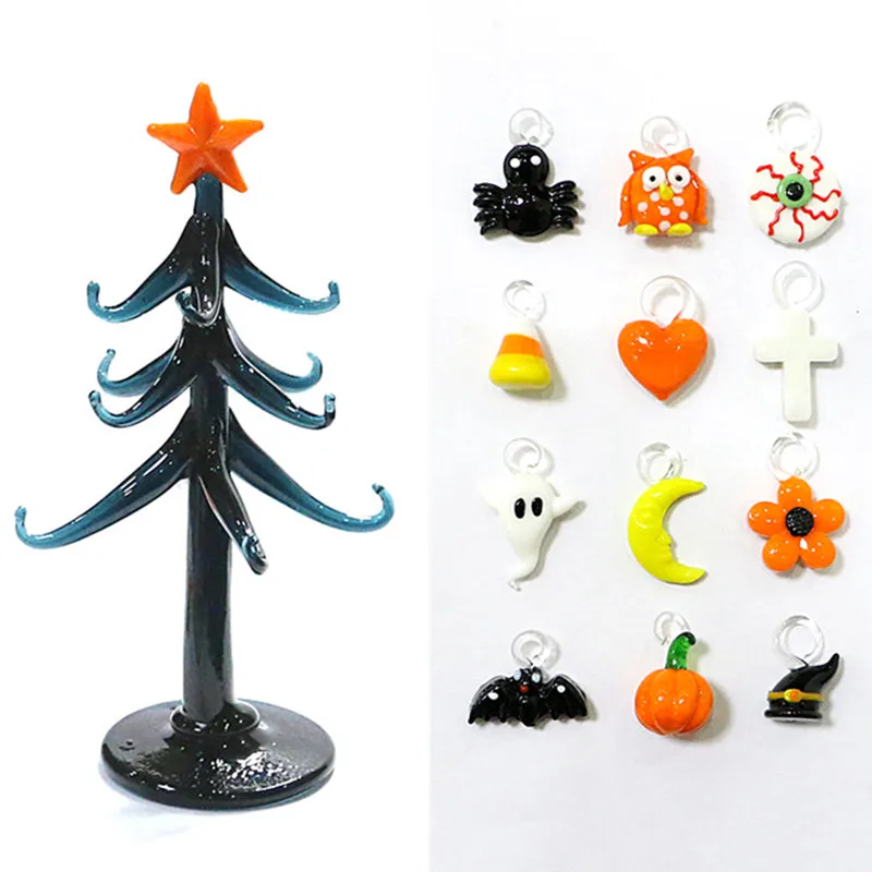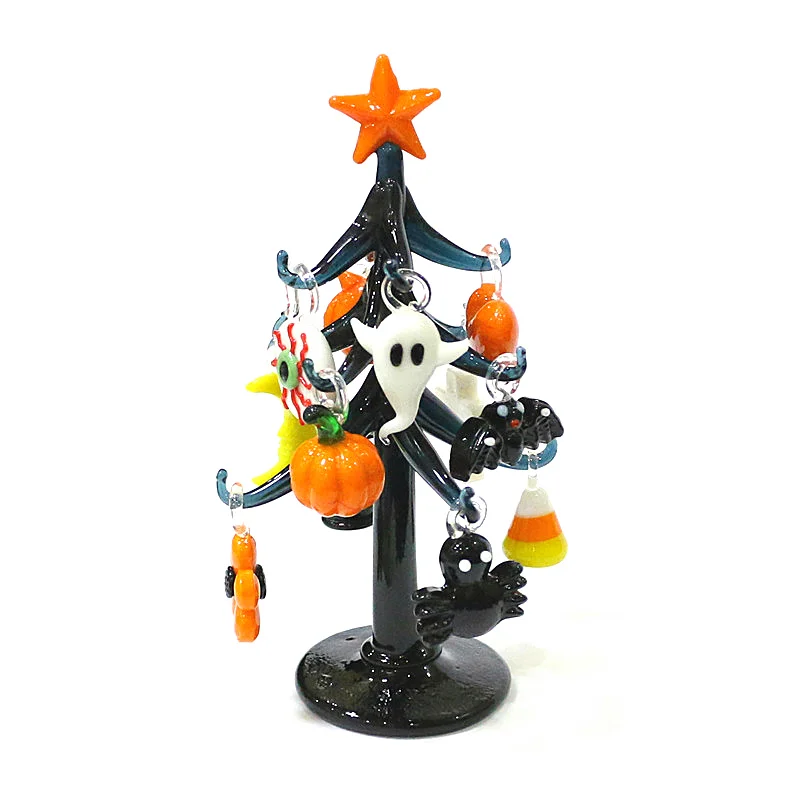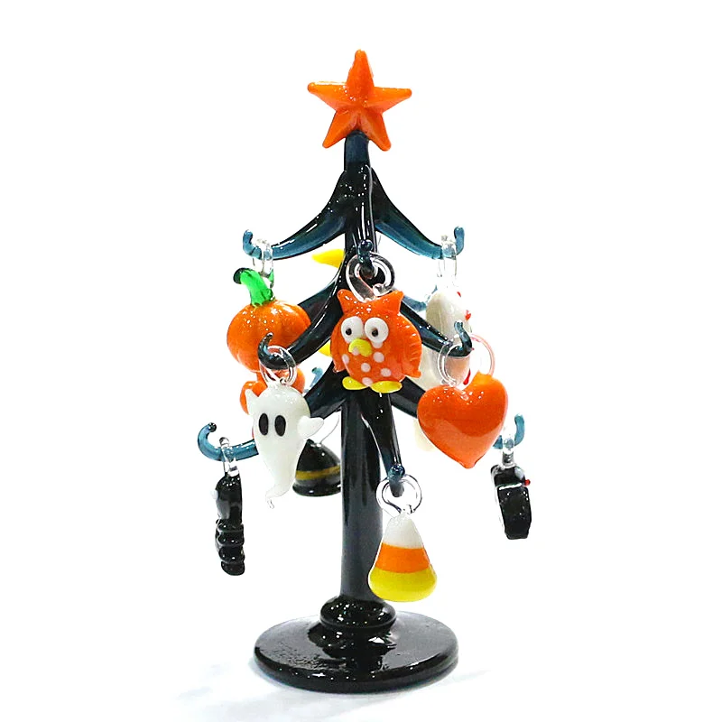 Halloween Decor Cute Glass Tree Figurine Ornaments with Mini Owl Spider Bat Pumpkin Cross Ghost Evil Eye Heart Moon Hat Pendant