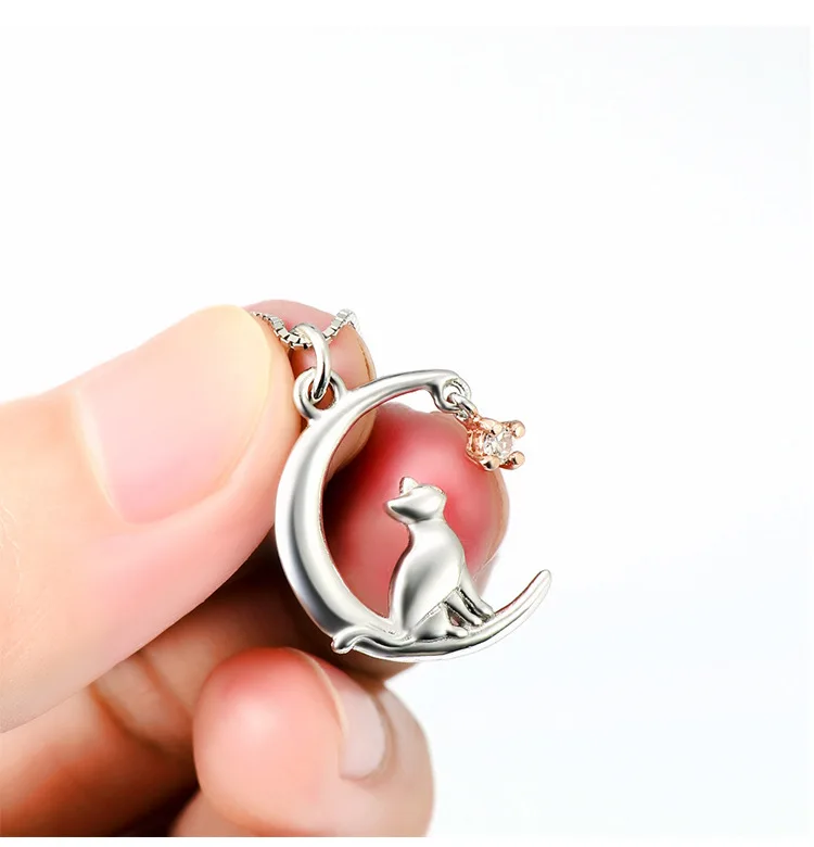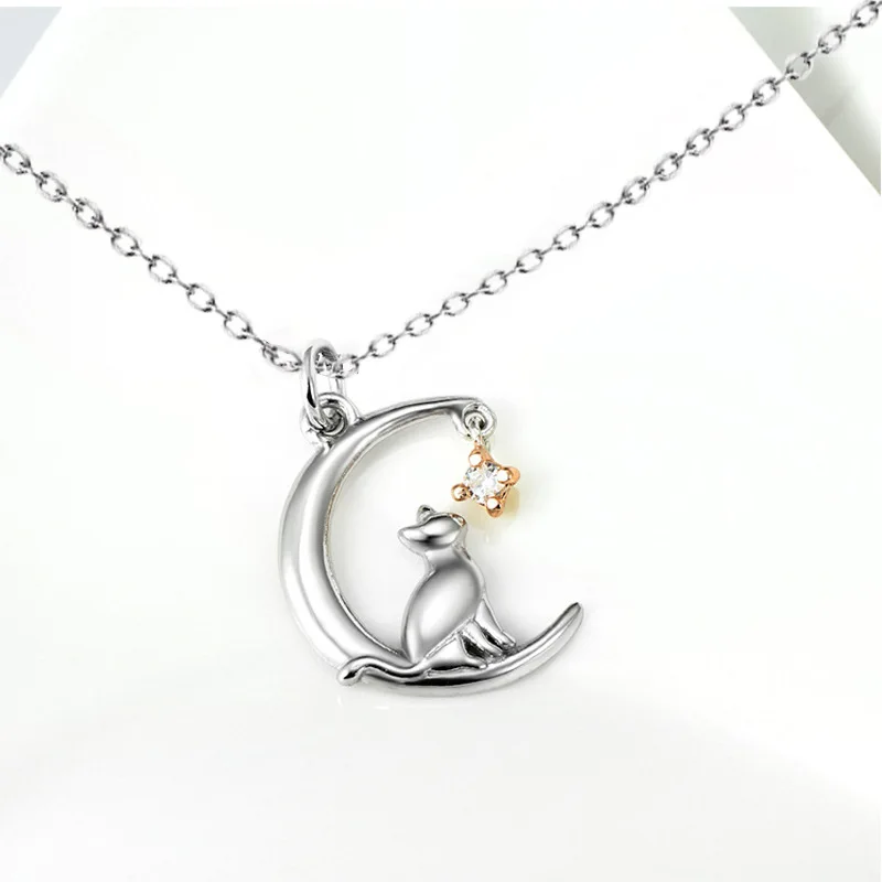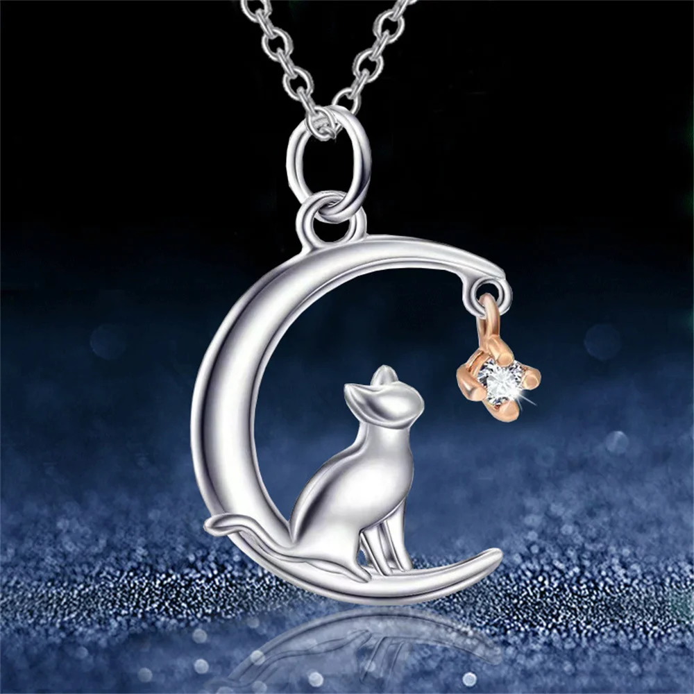 Lovely Moon Kitten Necklace for Women Fashion Cat Animal Heart Shaped Pendant Clavicle Chain Choker DIY Jewelry Accessories Gift