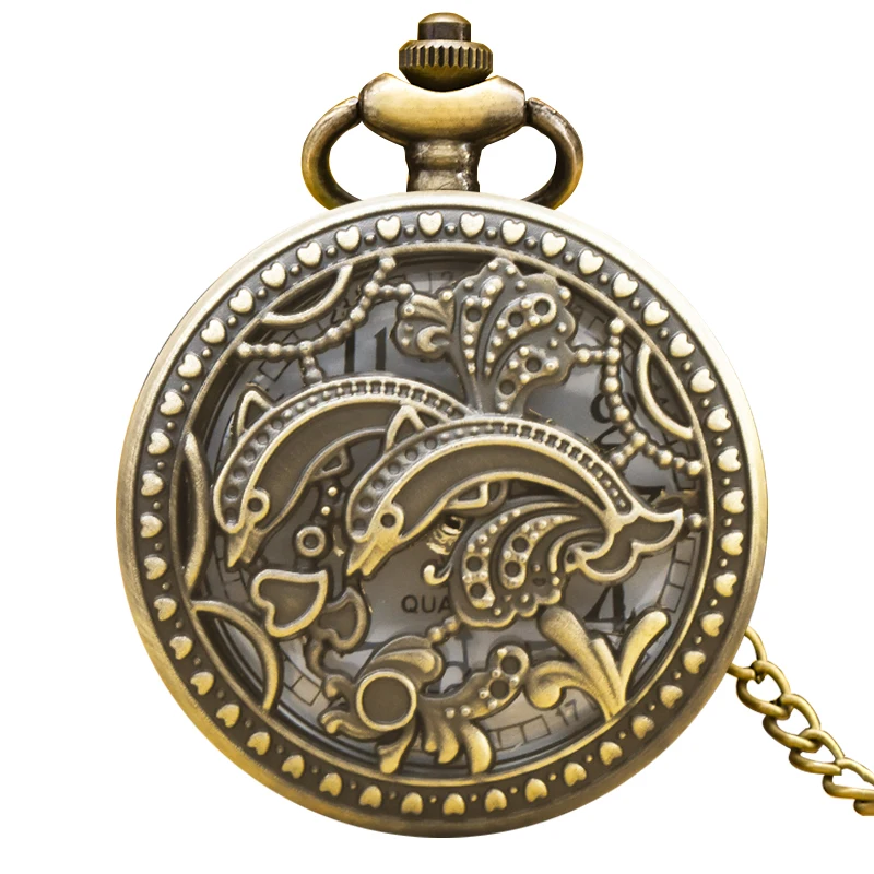Vintage Bronze Steampunk Jumping Dolphin Sculpture Quartz Pocket Watch Necklace Pendant Clock Chain Men Women Chain Gift